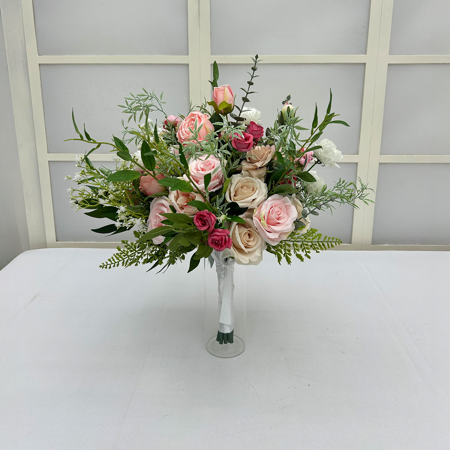 Our Bridal Bouquet (with Ribbon) is a beautifully finished, ready-to-use bouquet designed for ceremony entrances, bridal portraits, and keepsake moments. Lightweight and easy to carry, it provides a polished finishing touch for bridal styling while offering a timeless accessory that complements a wide range of wedding themes and venues.