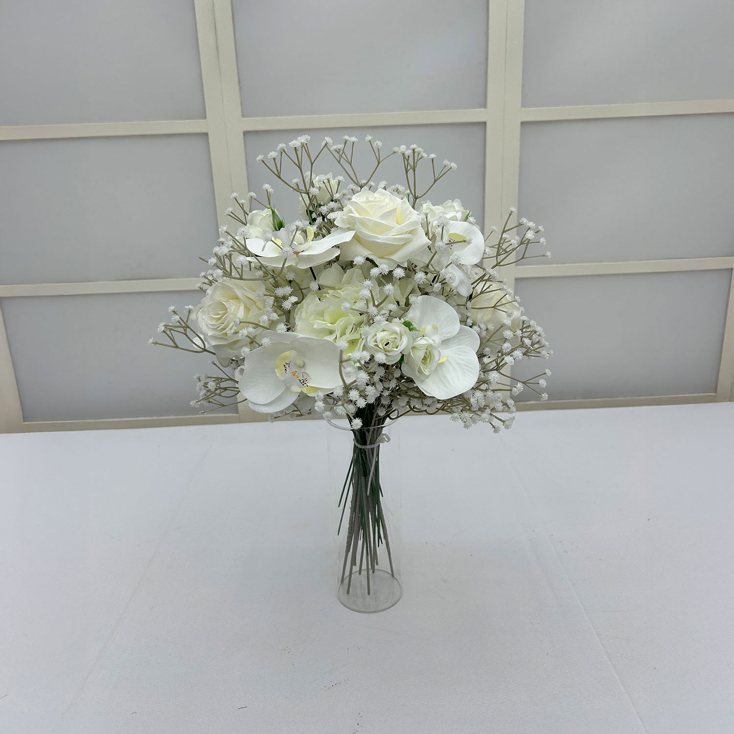 The Signature Faye Collection takes inspiration from soft, graceful florals. With white gypsophila, ivory roses, ivory spray roses, and white orchids, this design blends delicate texture with a refined, modern finish.