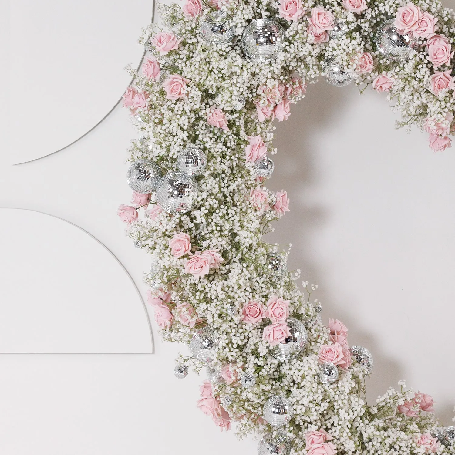 The Mayfair Collection takes inspiration from modern romance. Dusky pink real-touch roses, real-touch gypsophila, and disco balls combine for a soft, chic look with a playful edge.