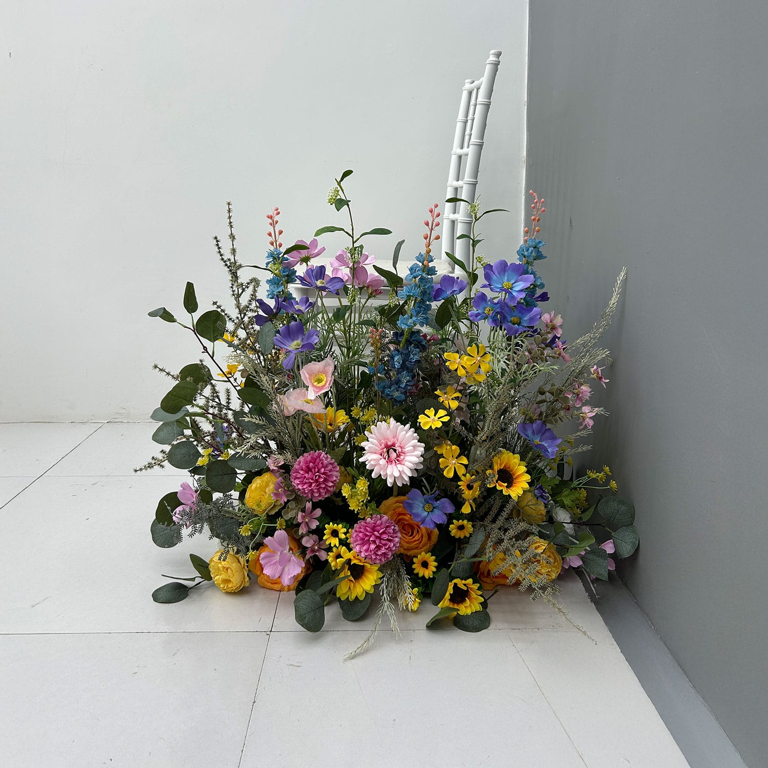 Our floral meadow is a versatile styling piece designed to add depth, softness, and visual interest throughout your event space. Perfect for placing at the base of arches and pillars, lining ceremony aisles, filling empty floor areas, or styling window ledges, its free-flowing design helps to connect larger installations and enhance overall layout. Equally effective as a standalone feature or as a supporting element within more elaborate displays, the floral meadow brings an effortless, organic finish that complements a wide range of event themes and settings.
