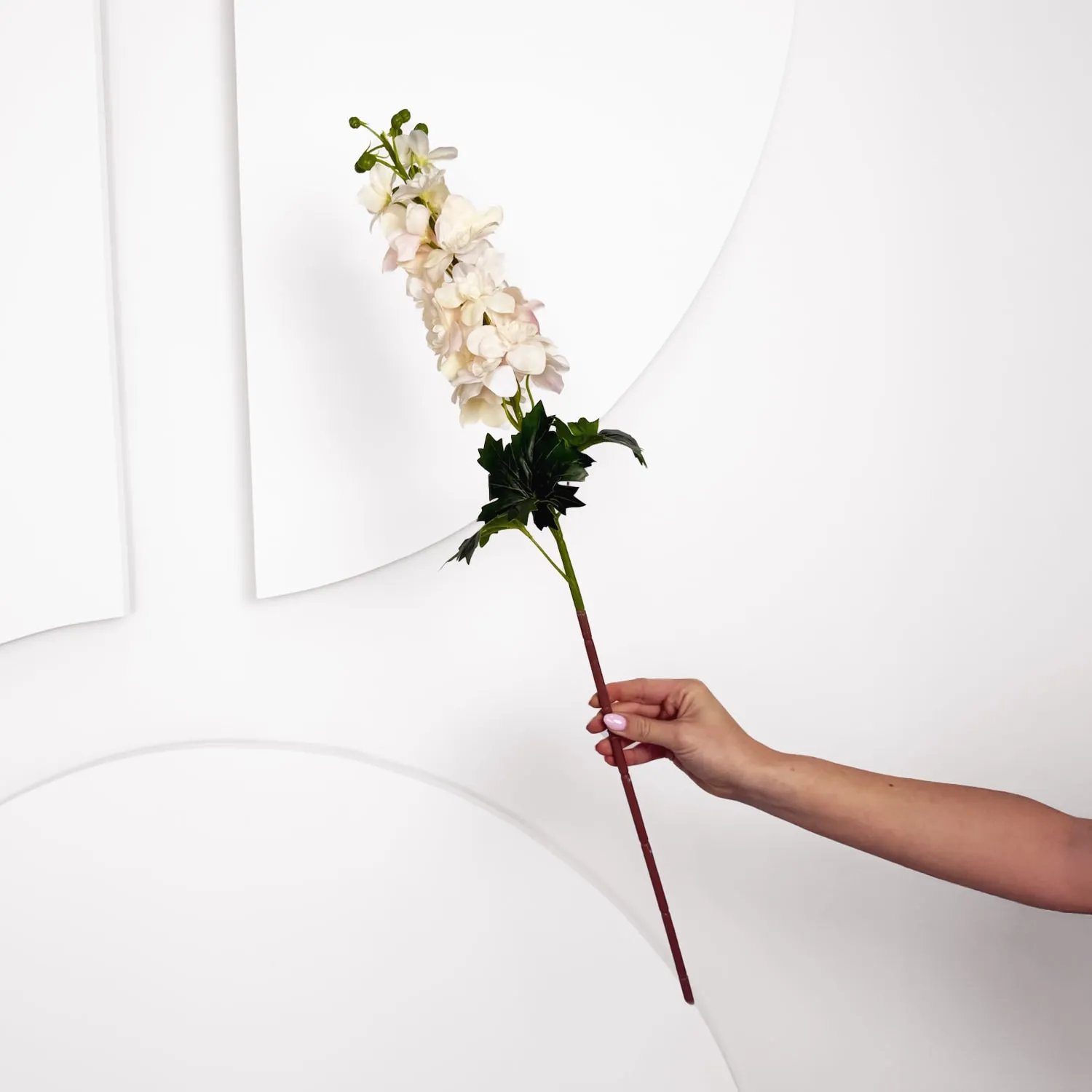 A tall 80cm light pink delphinium stem with a natural feel. Designed for statement arrangements, layered displays, or use as a feature stem in larger installations.